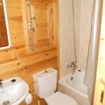 Inside, you’ll find a comfortable double bedroom and two lofts with mattresses. The kitchen is fully equipped so you can prepare your meals with ease, while the bathroom includes a mini bathtub. The cabin’s covered terrace is perfect for relaxing and enjoying the outdoors at any time of the day.