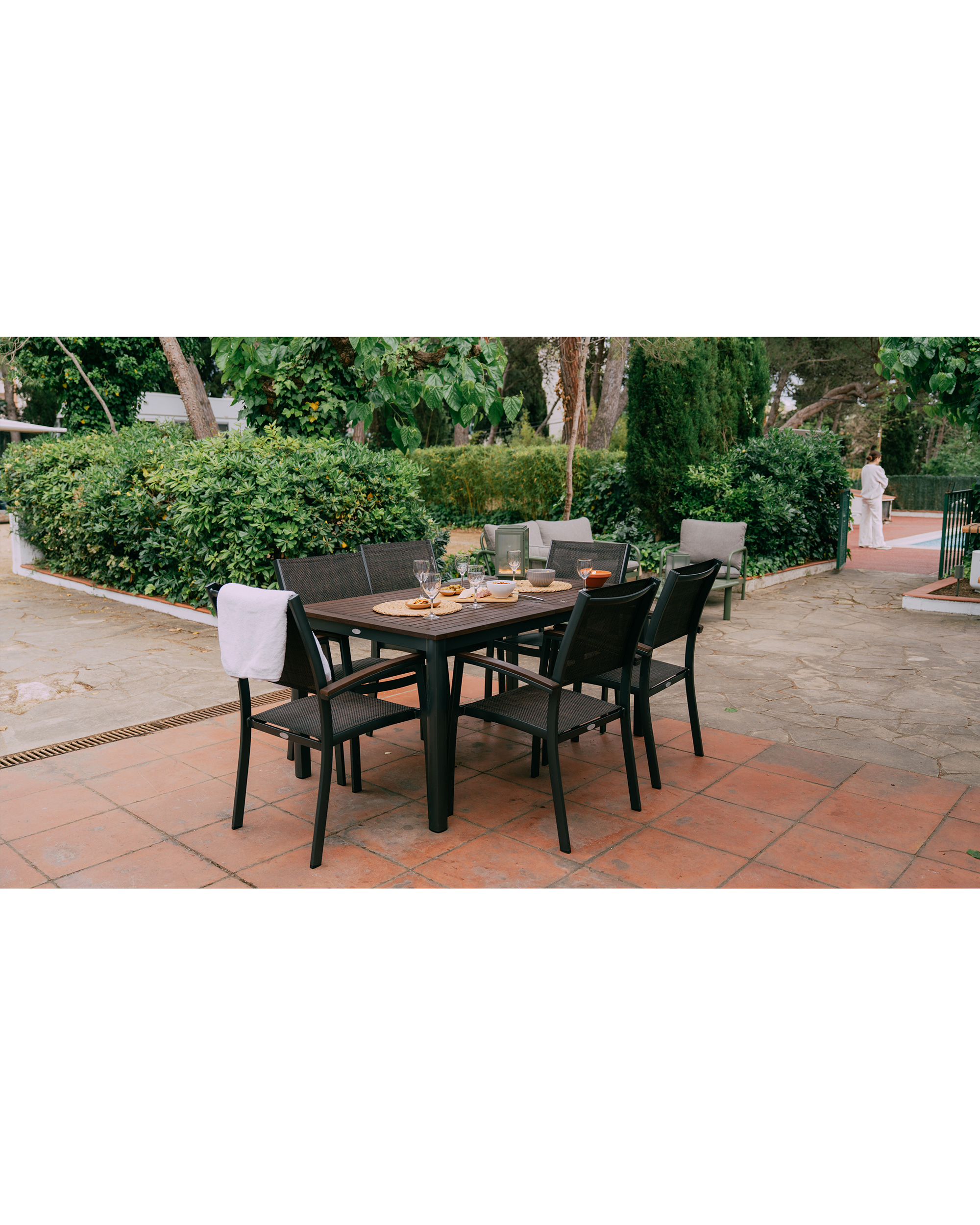 Terras: Zeer groot; tafel, ligstoelen en stoelen.